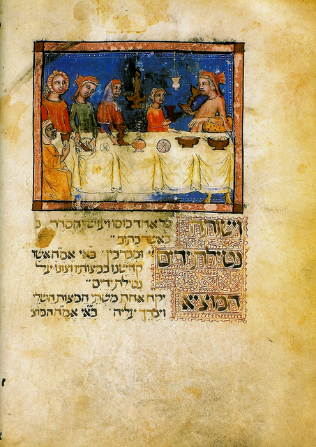 Some mysteries remain opaque, such as the identity of the dark-skinned woman at the all-female Seder table. Her exotic headgear and position opposite the woman of the house and lower in the frame indicate that she might be a Moorish servant, but she is seated and clearly participating in the meal. Is she a convert? Perhaps a guest? The problem is compounded by the fact that portraits in medieval manuscripts of this nature often reflect the faces of the family that commissioned the artist. In other words, this particular illumination is most likely a representation of the first owners of the Sarajevo Haggadah who felt the mysterious woman (girl?) was sufficiently important that she be included as part of the household.