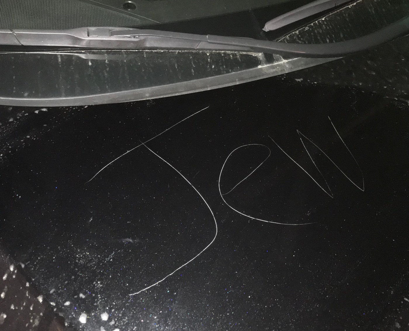 So it’s a kindness on your part to simply label me “Jew,” something I would proudly affirm. Your hateful, anonymous scribblings on the hood of my car just reinforces solidarity with my ancestors who endured far worse, as well as my African-American neighbors who moved to our safe Jewish neighborhood because you scrawled a swastika on their front door.