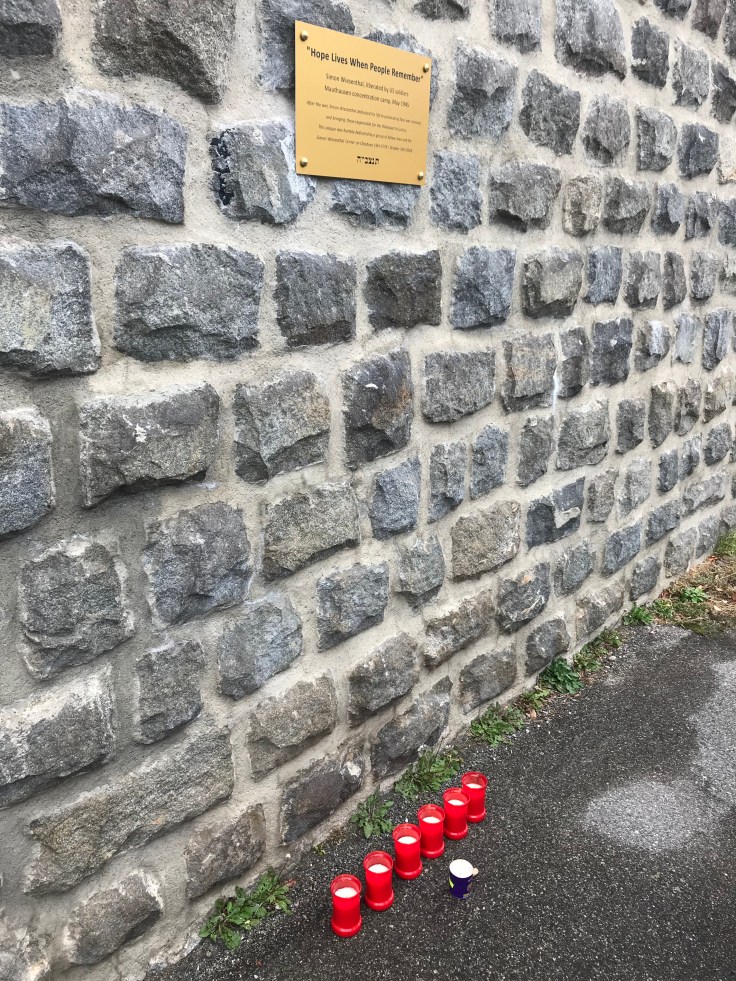 By the time Simon Wiesenthal arrived in February 1945, he had already seen the interior of eight concentration camps. Deeply malnourished, he was left to die in quarantine, but somehow managed to survive on a diet of 200 calories per day until liberation, willed on by an indomitable determination to seek justice. His survival was not typical—the last prisoner formally inducted into Mauthausen was given the number 139,157, just two days before the camp was liberated in May 1945. An estimated 119,000 prisoners were killed there, nearly forty thousand of whom were Jews. For many, the end came in the cramped gas chamber located under one of the administrative buildings, their physical remains reduced to ash in the crematoria next door. Today a makeshift memorial, consisting of flowers, flags and a Yartzeit candle and a few flags memorialize the diversity of Mauthausen’s victims.