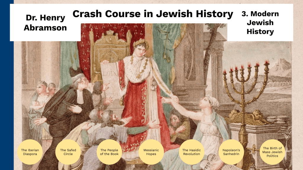 Looking forward to seeing you for the third installment in our fairly popular Crash Course in Jewish History. We’re grateful for the positive response from the live audience, not to mention an unusually large number of online views: as I write this post, the first two parts have been viewed about 19,000 times, with a remarkably strong audience retention factor: the average viewer stayed on site for over eighteen minutes, an auspicious number for sure. On the other hand, I’m getting a larger share of comments from crazy people, but I guess that’s the trade-off.