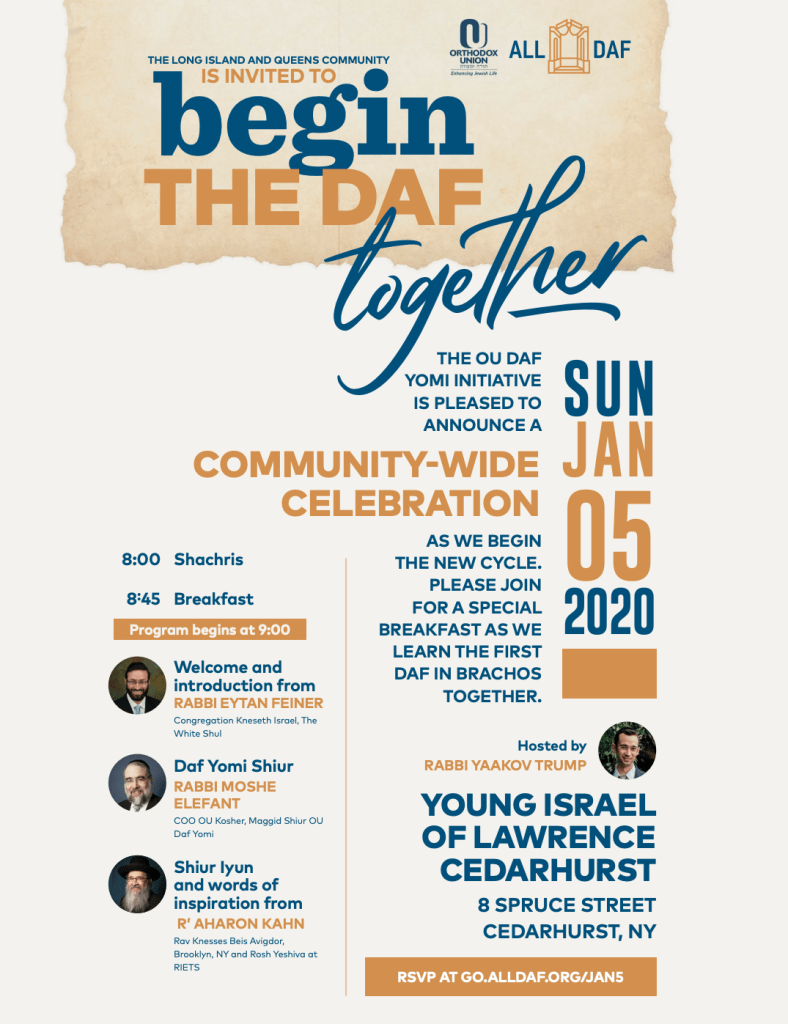 Friends, if the second best thing is to go to the Siyum Ha-Shas tomorrow morning, certainly the very best thing is to start Daf Yomi on Sunday. Let’s do it together at YILC! And for those of you who live too far away to enjoy the breakfast: be sure to download the free All Daf app for Apple or Android.
