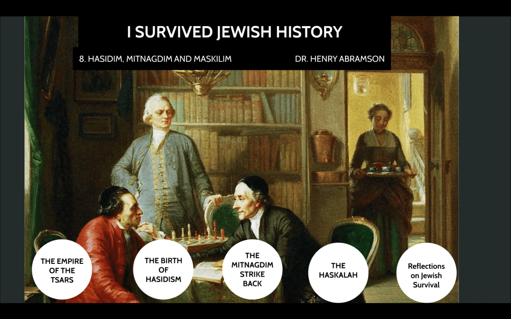 Tonight at 7:30 pm EST: Part VIII of the I SURVIVED JEWISH HISTORY SERIES, looking at the birth of Hasidism in the context of 18th and 19th century Russian history, the reaction of the Mitnagdim, and the influence of the Haskalah.