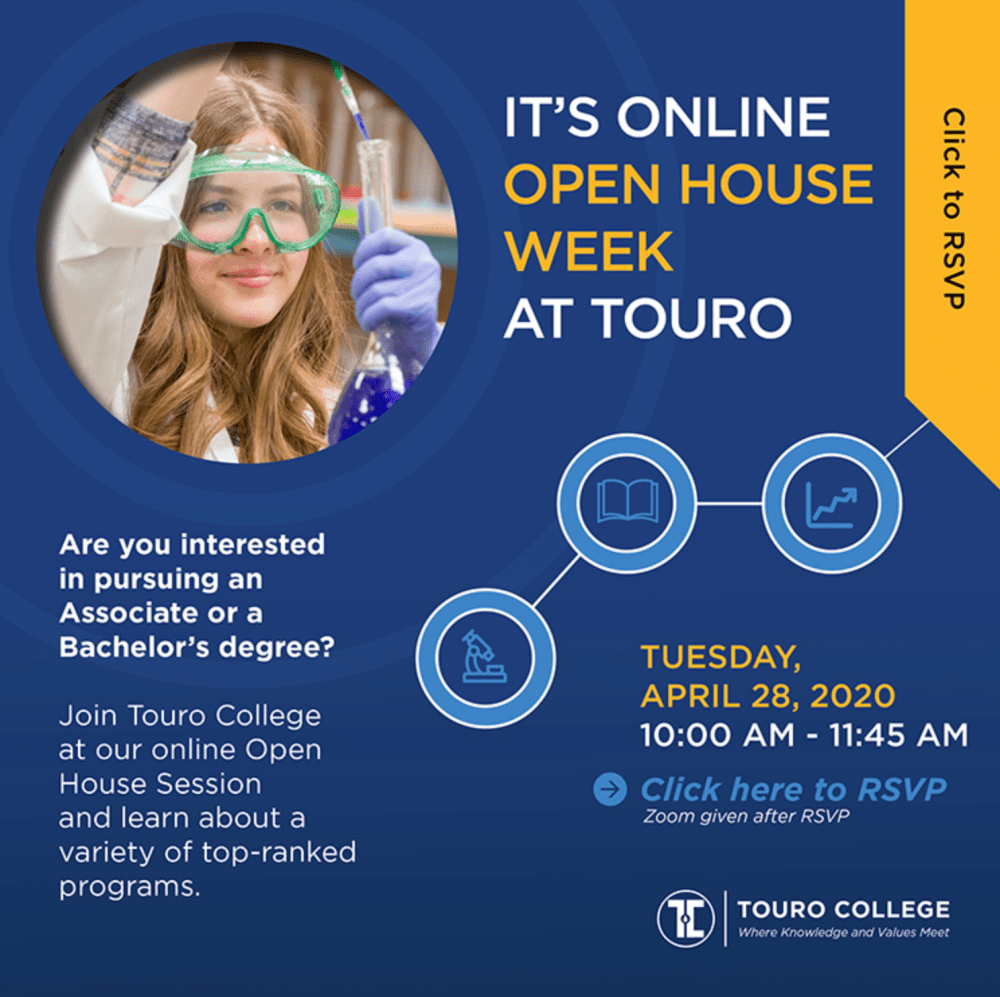 Pleased to host this Virtual Open House for Machon L’Parnasa Institute for Professional Studies, together with Director Esther Braun, on Tuesday April 28 at 11:00 am. Click on the image or visit http://machon.touro.edu/events/list/virtual-open-house-42820.php to RSVP!