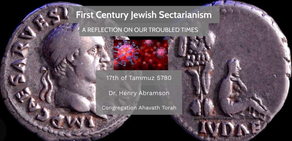 The Humility of Rabbi Zecharyah: Jewish Sectarianism in the First Century, the Beginning of our Exile, and a Reflection of our Troubled Times. Webinar sponsored by Congregation Ahavath Torah (Englewood, NJ) in commemoration of the communal period of reflection and Teshuvah that begins on the 17th of Tammuz. Lecture by Dr. Henry Abramson, Dean and Historian at Touro College, followed by Q & A. Thursday, July 9, 7:00 PM EDT. Register at https://zoom.us/webinar/register/WN_KB4gUu72Skmoo1tloqvubQ