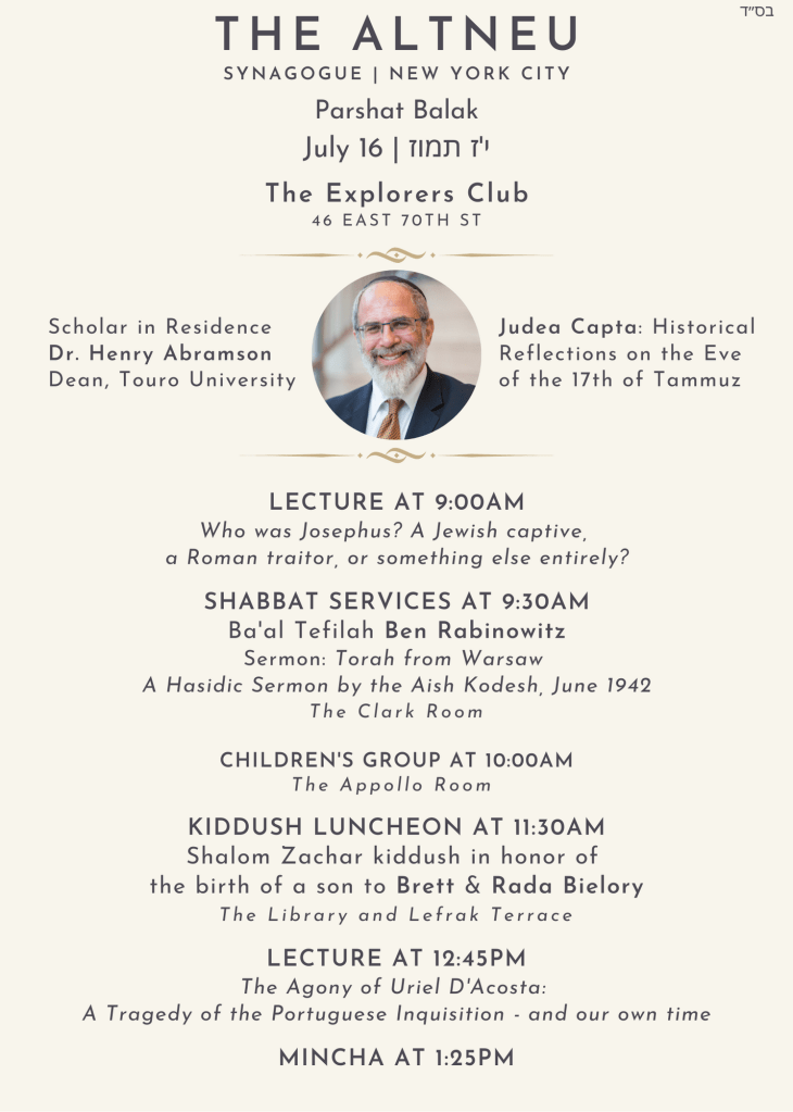 Honored to be meeting the unique congregation I’ve heard so much about, led by Rabbi Benjamin Goldschmidt and Rebbitzen Avital Chizik-Goldschmidt. I plan to offer three lectures on aspects of captivity in Jewish history, looking at the very different biographies of Josephus, Rabbi Kalonymus Kalmish Shapiro, and Uriel D’Acosta. RSVP is required, please visit https://thealtneu.org/home for details.