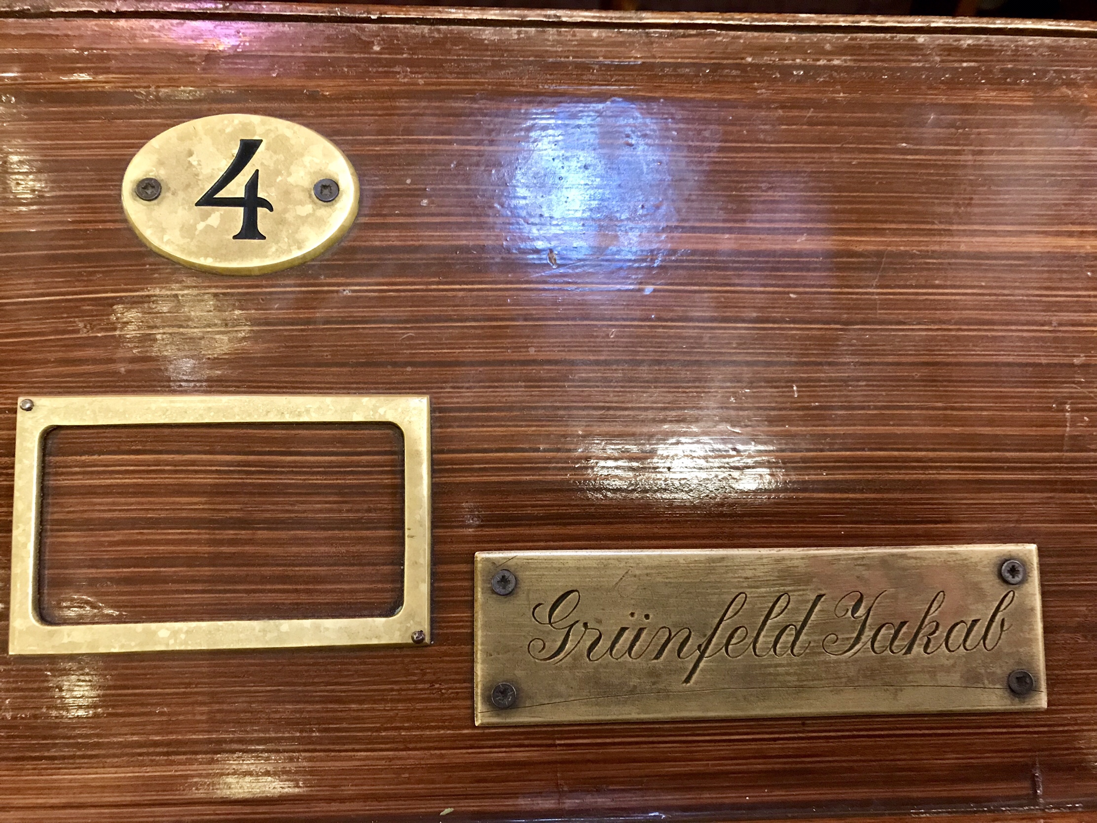 Elegant, personalized nameplates adorn the pews of the Dohany synagogue.