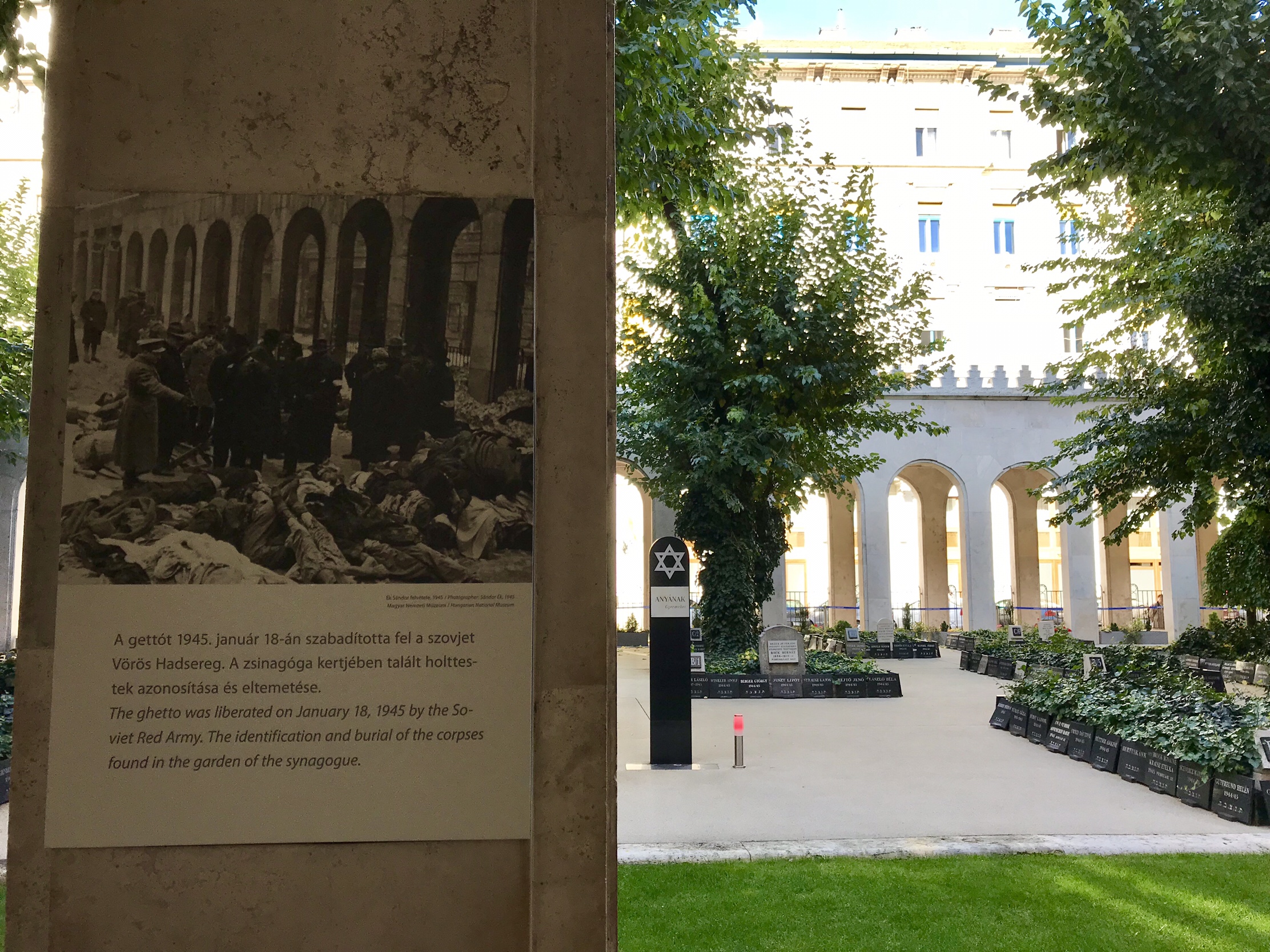 The mass grave in the courtyard of the Dohany synagogue, with a historical photograph documenting the difficult process of identifying the remains of the Jews murdered here.