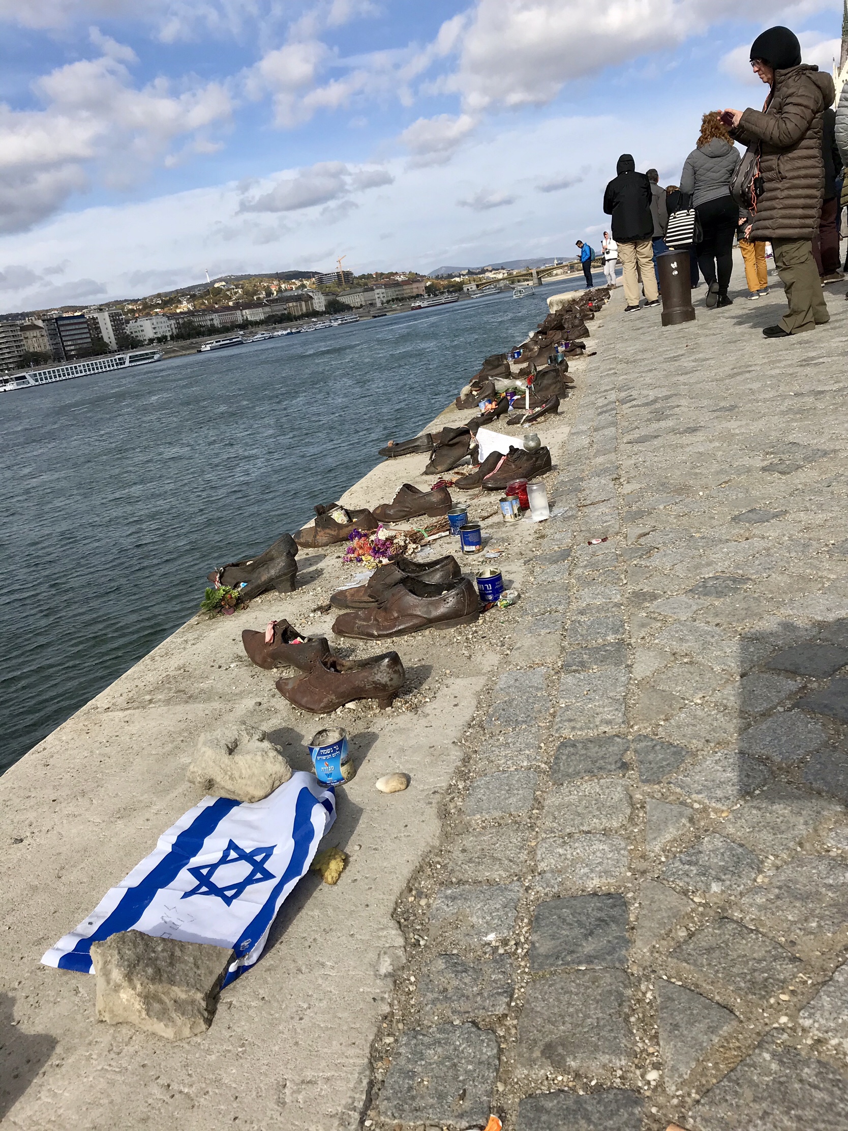 The Budapest Jewish community is thriving, particularly the Hasidic community–at several points in my journey, from the airport to the streets of the reawakening Jewish quarter, I encountered Jews dressed like my brothers and sisters in Boro Park and Crown Heights. Nevertheless, the markers of what has been lost are everywhere in this city. One of the most moving monuments is a series of brass shoes lined up by the Danube River, marking the spot where the Arrow Cross–the indigenous Hungarian fascist party–removed Jewish men, women and children from the protected so-called “International Ghetto” and shot them, tossing their bodies into the blue Danube. In some cases, the sadistic imitators of the Nazis tied three Jews together, shot the middle Jew threw them all into the river, saving bullets and entertaining themselves by watching the two living Jews struggle hopelessly to take one last breath of sweet air.