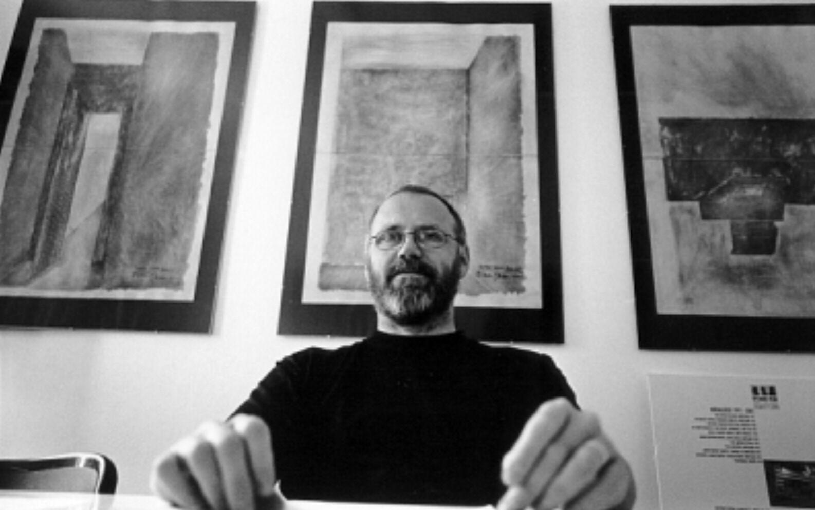 Architect Martin Kvasnica. Drawing of the entrance to the Hatam Sofer memorial is on the left.