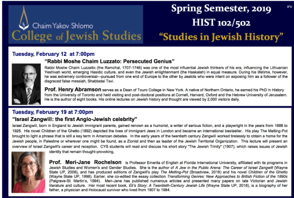Really excited to be starting the Spring Semester of Jewish History Lectures next week–it’s going to be a busy February, but I’m certainly looking forward to speaking with you about these fascinating topics! Here’s a quick list of what, where, and when. Unfortunately not all of these lectures will be available on video, so please come in person if you can! Just one thing: no hard questions, please.