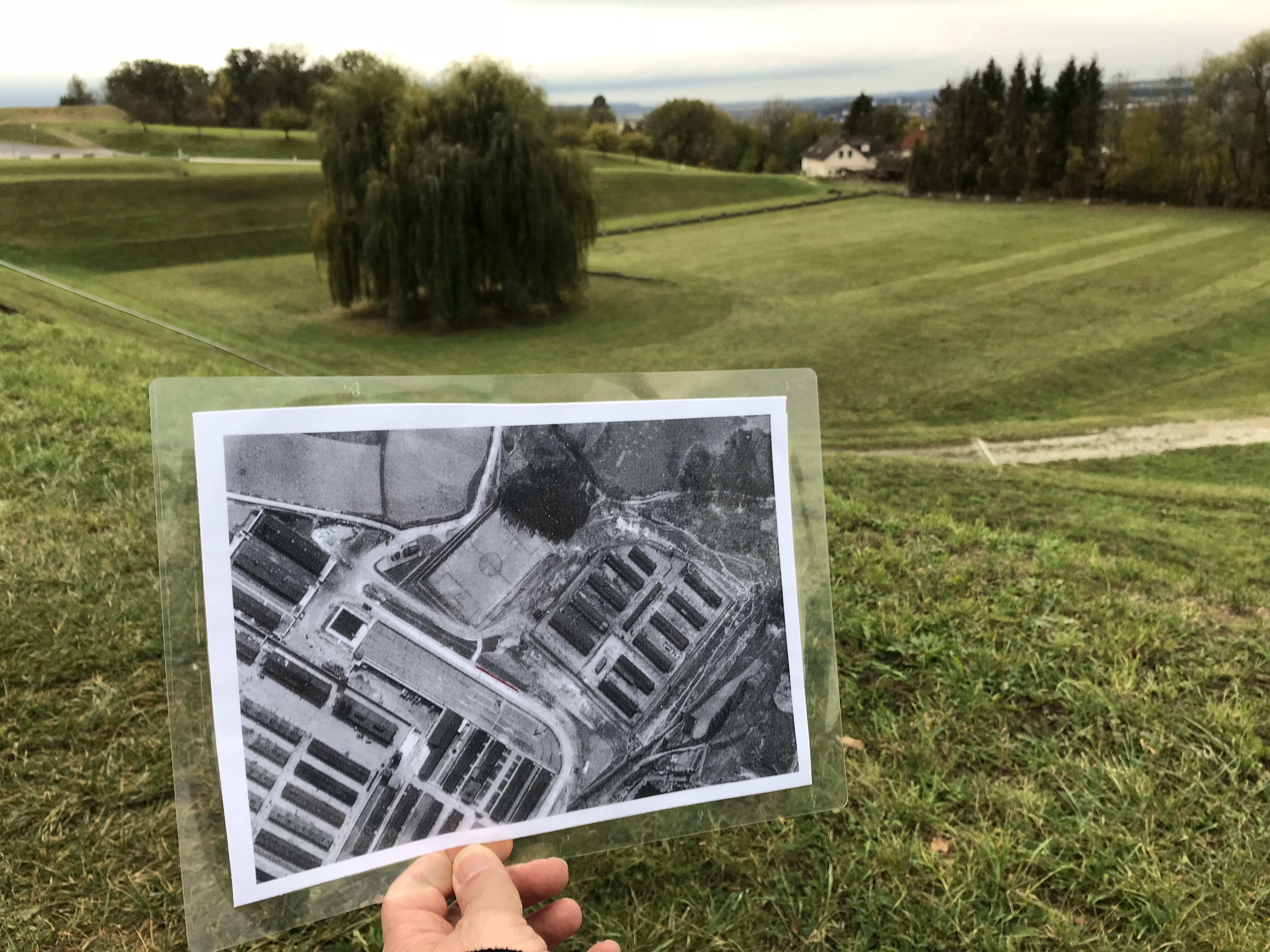 Holding an aerial photo in front of the guards’ soccer field at Mauthausen.