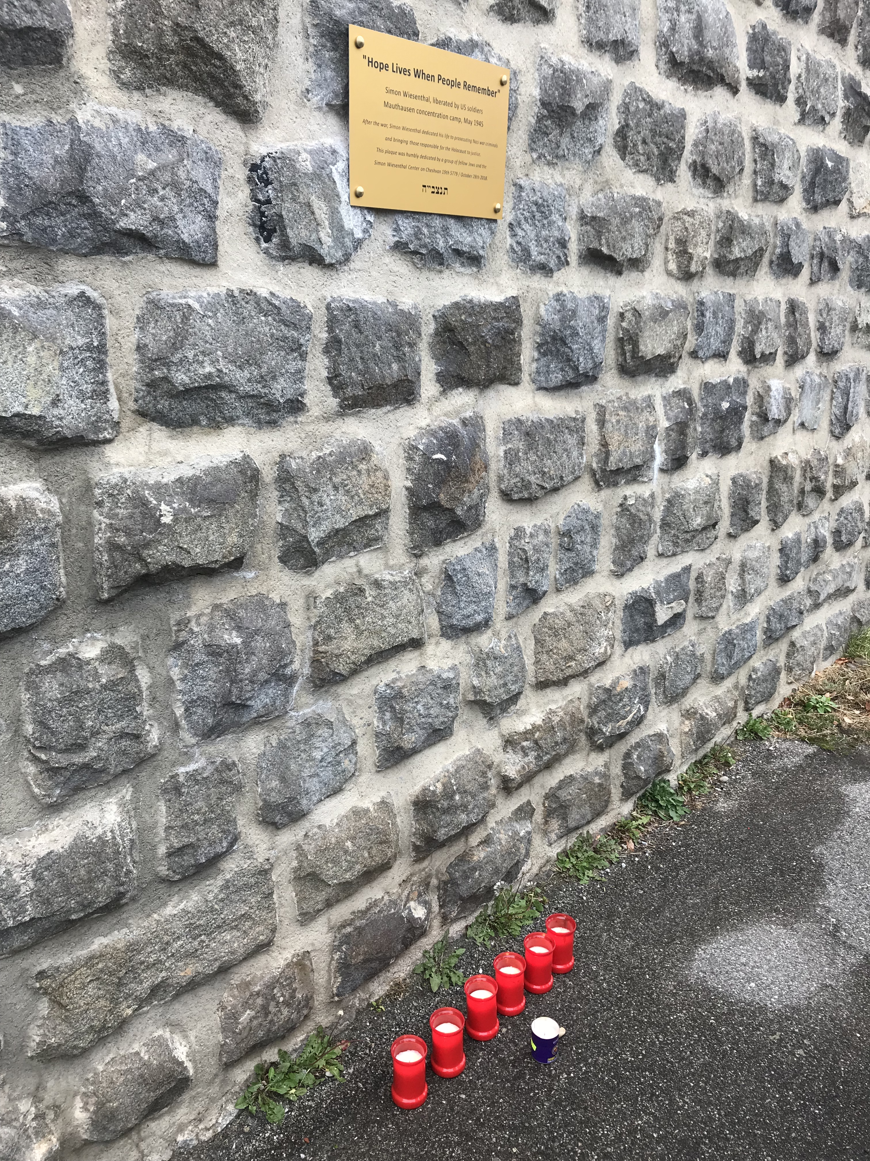 By the time Simon Wiesenthal arrived in February 1945, he had already seen the interior of eight concentration camps. Deeply malnourished, he was left to die in quarantine, but somehow managed to survive on a diet of 200 calories per day until liberation, willed on by an indomitable determination to seek justice. His survival was not typical—the last prisoner formally inducted into Mauthausen was given the number 139,157, just two days before the camp was liberated in May 1945. An estimated 119,000 prisoners were killed there, nearly forty thousand of whom were Jews. For many, the end came in the cramped gas chamber located under one of the administrative buildings, their physical remains reduced to ash in the crematoria next door. Today a makeshift memorial, consisting of flowers, flags and a Yartzeit candle and a few flags memorialize the diversity of Mauthausen’s victims.