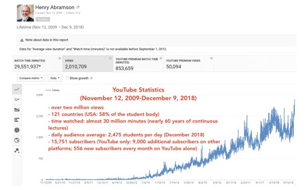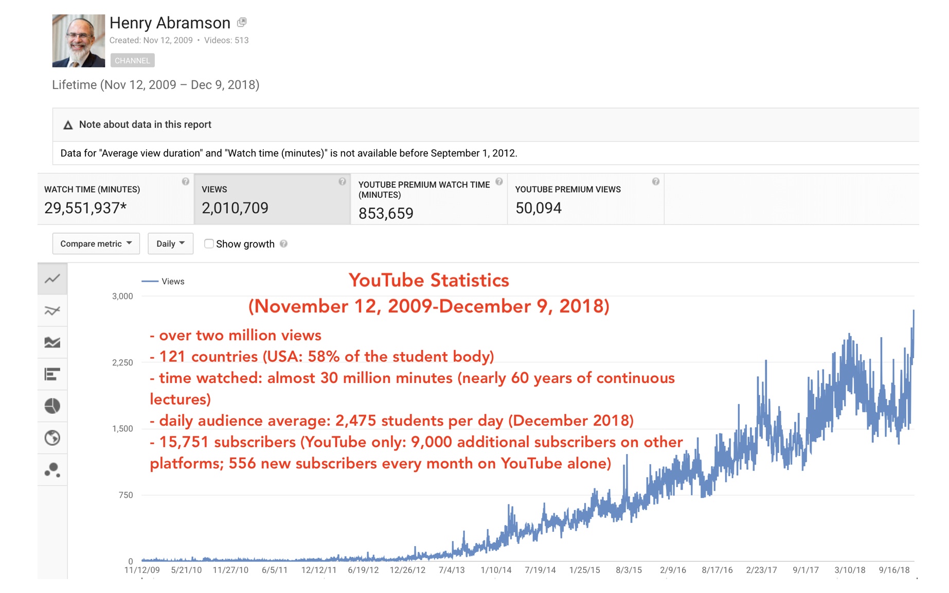I resolved to take my passion for Jewish history and build an online classroom optimized for digital natives (i.e. anyone born after 1985). The idea was to create a living library in the mobile phone of every Jew world-wide, where one could wander the stacks and discover the volumes with their own names on the spines. I began experimenting by uploading my weekly classes at a local synagogue to YouTube—to my surprise and delight, the lectures rapidly found a wide and diverse audience. Over 500 lectures later, and using several social media platforms, I am still amazed by the statistics. Here’s an annotated screenshot, for example, of the YouTube analytics: