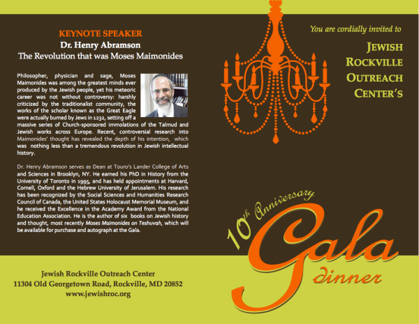 Very pleased to be invited to speak about Maimonides at the Tenth Anniversary Gala Dinner of the Jewish Rockville Outreach Center!